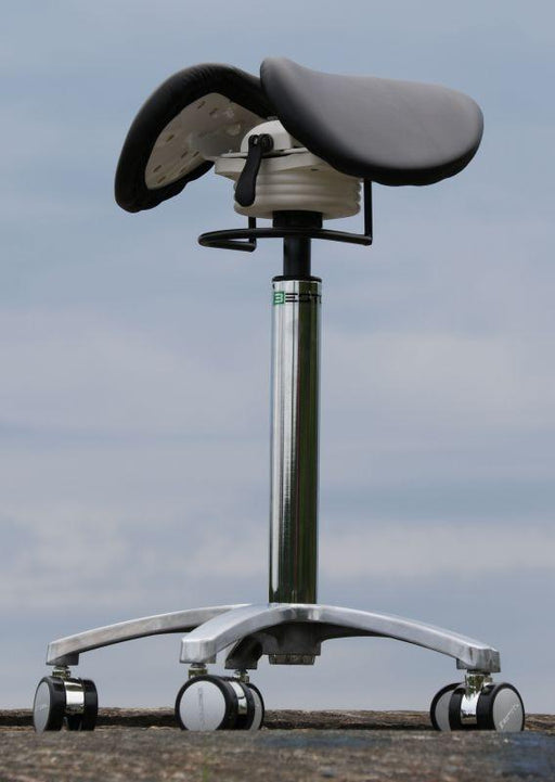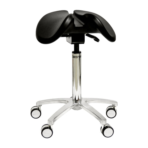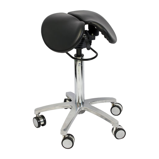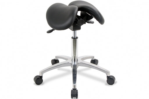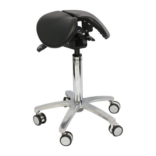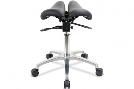 Ergonominen kaksiosainen satulatuoli, jonka istuin on leveyssäädettävä. Istuimessa on myös kallistuksen säätö. Pehmustettu istuin on verhoiltu aido...