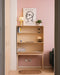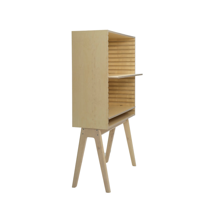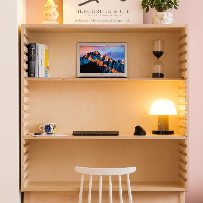 Open cabinet, which is also a workstation. The product combines home and remote working in a completely new way. Here you can surround yourself with your favorite objects or plants while still doing work tasks. The Frame has movable levels in two different depths that you can customize, decorate and bring objects close to you.