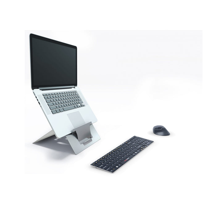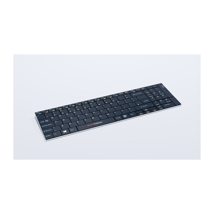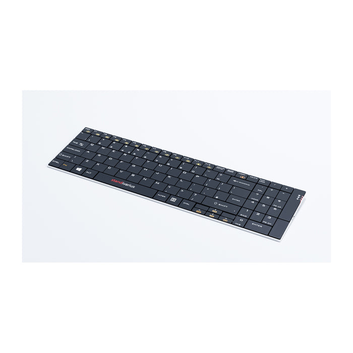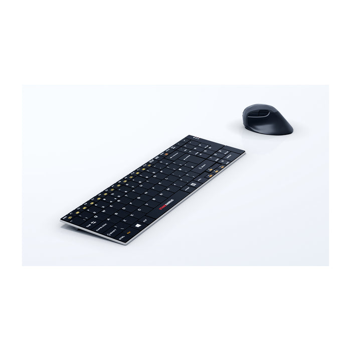 An ultra-slim keyboard for mobile workers with a responsive key action and aluminium casing. The UK key layout includes hot-keys for internet, email and audio with LED indicators for caps, battery and recharge status. It also features a full-size number pad and comes supplied with charging lead, micro USB receiver and magnetic tilt-strip.