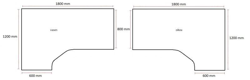 Pöytälevyn koko 1800(800) x 1200(600) mm, paksuus 25 mm. Materiaali melamiini.